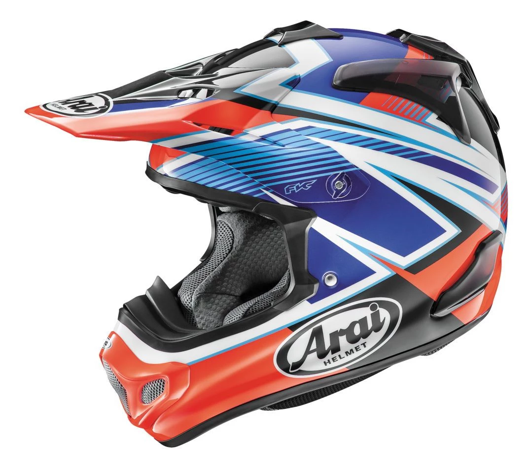 The Arai VX Pro4 Helmet is for the serious off-road rider. The cLc (complex Laminate construction) shell is based on Arai’s R75 Shape Concept and is optimized for strength, and the peak, mouth vent and top vents are all designed to break away upon impact, leaving less surface mass to catch or bind. The Facial Contour System (FCS) works with a foam spring support in the cheek pad that compresses and rebounds as you remove or put on the helmet, and feature Arai’s signature triple-density foam construction. The eyeport is extremely wide and is large enough to accommodate even the largest goggles for a panoramic view of your surroundings. All the VX Pro vents have been redesigned, including a chin vent which has been moved to the outside of the helmet, which in turn makes the helmet roomier in the chin area.
