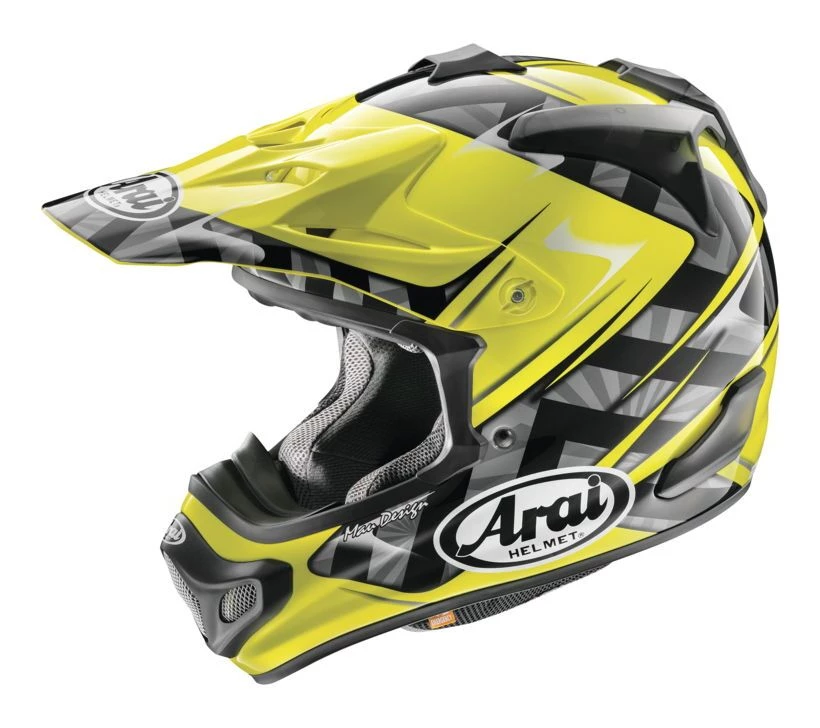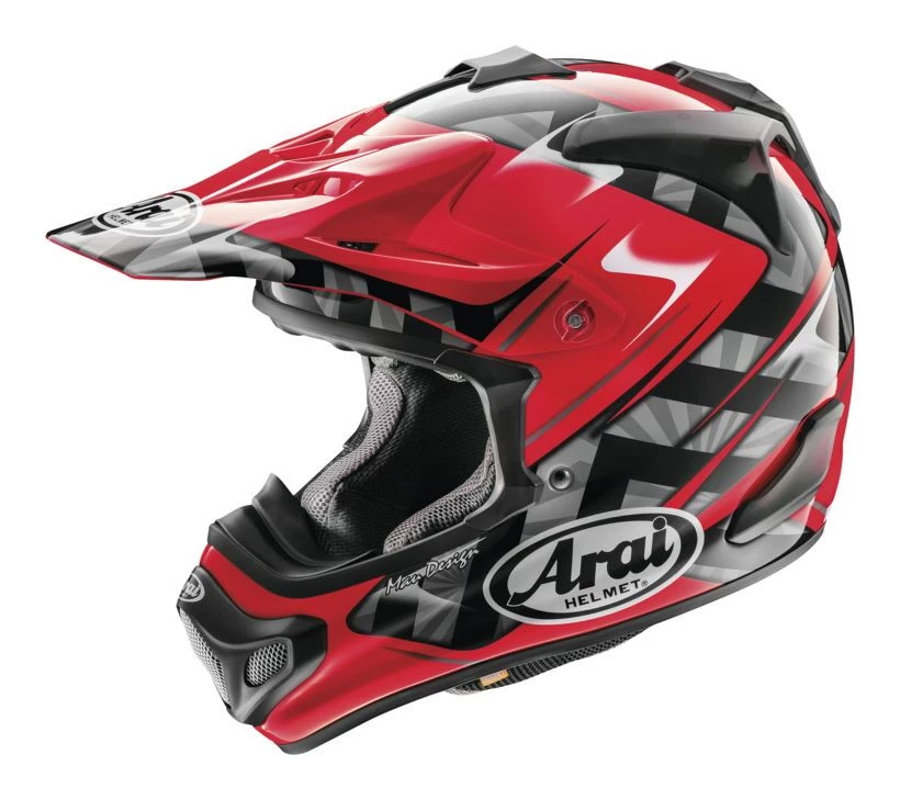 The Arai VX Pro4 Helmet is for the serious off-road rider. The cLc (complex Laminate construction) shell is based on Arai’s R75 Shape Concept and is optimized for strength, and the peak, mouth vent and top vents are all designed to break away upon impact, leaving less surface mass to catch or bind. The Facial Contour System (FCS) works with a foam spring support in the cheek pad that compresses and rebounds as you remove or put on the helmet, and feature Arai’s signature triple-density foam construction. The eyeport is extremely wide and is large enough to accommodate even the largest goggles for a panoramic view of your surroundings. All the VX Pro vents have been redesigned, including a chin vent which has been moved to the outside of the helmet, which in turn makes the helmet roomier in the chin area.